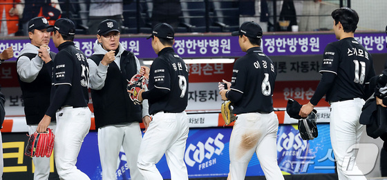 15일 서울 송파구 잠실야구장에서 열린 '2026 신한 SOL KBO리그' 롯데 자이언츠와 LG 트윈스의 경기, 8회말 2사 주자 1루 상황에 LG 오스틴의 타구를 우익수가 잡아내며 이닝을 마치자 롯데 김원중이 마운드에서 내려와 야수들을 맞이하고 있다. 2026.4.15 © 뉴스1 박정호 기자
