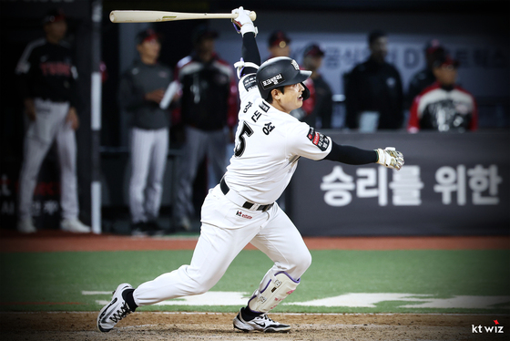 KT 위즈 강민성이 28일 열린 KBO리그 수원 LG 트윈스전에서 연장 10회말 끝내기 안타를 때려 팀의 6-5 승리를 이끌었다. (KT 위즈 제공)