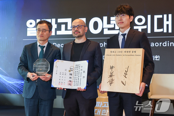 데미스 하사비스 구글 딥마인드 공동 창업자 및 CEO와 신진서 9단이 29일 서울 중구 웨스틴조선호텔에서 '알파고 10년 : 위대한 동행' 행사에 참석해 친선대국을 마친 뒤 기념 촬영하고 있다. 왼쪽은 양재호 한국기원 사무총장. 2026.4.29 © 뉴스1 안은나 기자