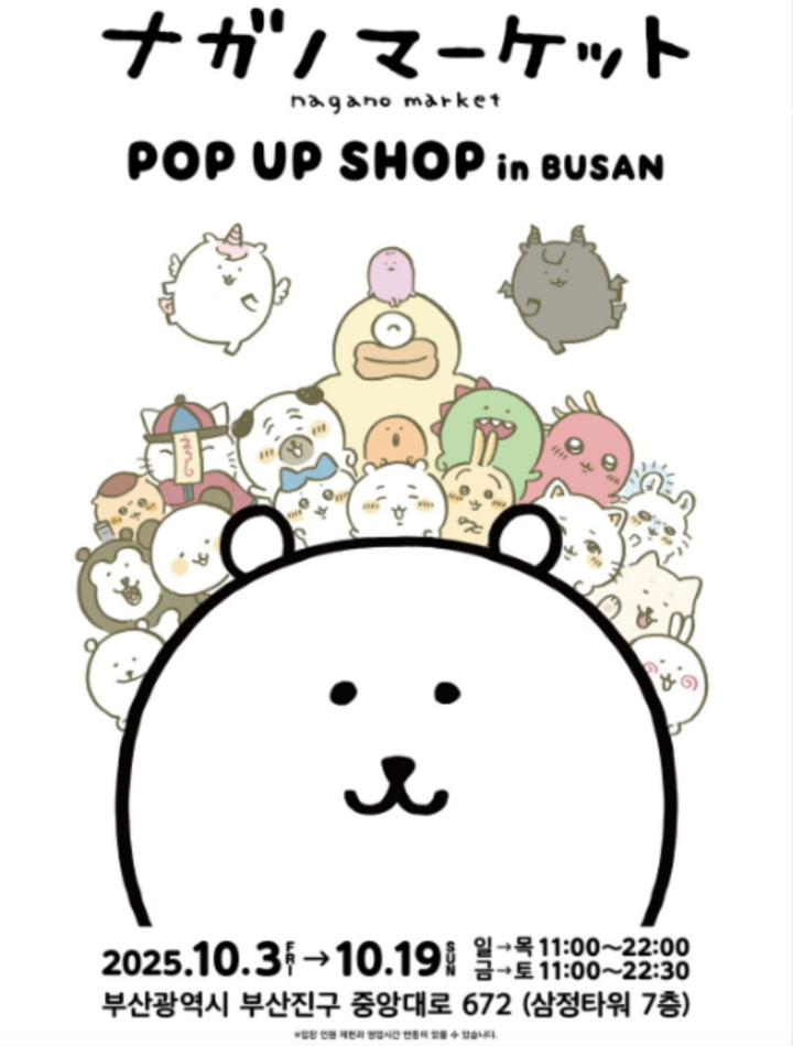 일러스트레이터 나가노의 인기 캐릭터들을 한자리에서 만날 수 있는 '나가노마켓' 팝업스토어가 부산을 찾는다. 지난 3일부터 오는 19일까지 부산 삼정타워 7층에서 열리는 이번 행사는 '농담곰' '치이카와'등 많은 사랑을 받는 캐릭터들의 공식 상품을 선보인다.