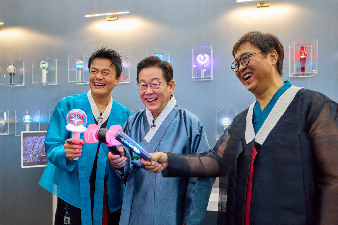 이재명 대통령이 1일 경기 고양시 킨텍스에서 열린 대중문화교류위원회 출범식 K컬처 체험존에서 블랙핑크 응원봉 점등을 하고 있다. 왼쪽부터 박진영 대중문화교류위원회 공동위원장, 이 대통령, 최휘영 문화체육관광부 장관. (대통령실 제공).