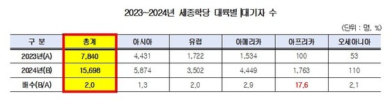 2023~2024년 세종학당 대륙별 대기자 수 (민형배 의원실 제공)