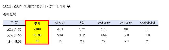 23일 국회 문화체육관광위원회 소속 민형배 의원(더불어민주당·광주 광산을)이 세종학당재단으로부터 제출받은 자료에 따르면, 지난해 세종학당 대기자 수는 전년 대비 약 2 배 증가했다 .