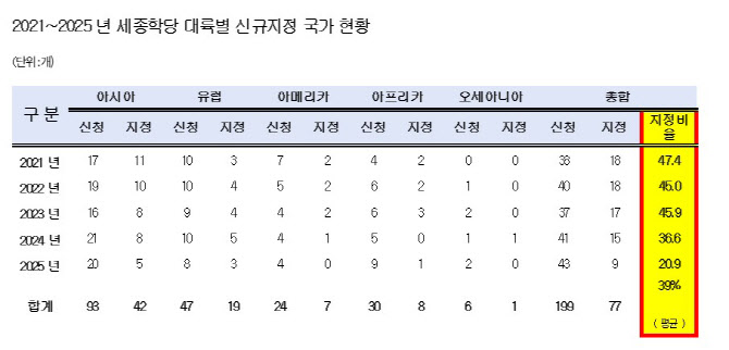 반면 세종학당 신규 지정은 대기자 증가세를 따라가지 못하고 감소 추세라는 게 의원실 측의 설명이다. 2021년에는 38개국이 신규 지정을 신청해 18개국이 최종 선정돼 지정 비율이 47.4%에 달했다. 그러나 2025년에는 43개국 중 9개국만 지정돼 비율이 20.9%로 급감했다.