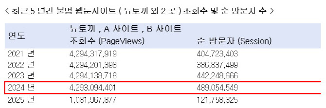 대표적인 불법 웹툰사이트 ‘뉴토끼’ 등 주요 사이트 트래픽 분석 결과, 2024년 한 해 동안 페이지 조회수는 42억 9309만회, 순 방문자 수는 4억 8905만명으로 집계됐다. 이는 대한민국 인구(2025년 10월23일 기준 KOSIS/5168만명)의 약 9배에 달하는 수치다 .