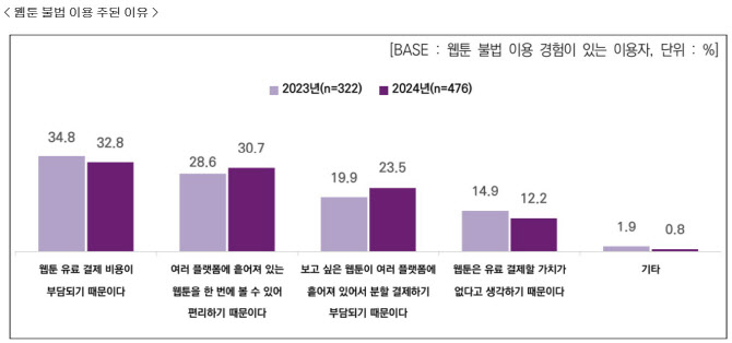 불법 웹툰이 만연한 이유로는 이용자의 인식도 한몫하는 것으로 분석됐다. 한국콘텐츠진흥원이 실시한 ‘2024 웹툰산업 실태조사’에 따르면, 불법 웹툰 이용 이유로 ‘유료 결제 비용 부담’(32.8%) 외에도 ‘웹툰은 유료 결제할 가치가 없다’(12.2%)는 응답이 상당수 나왔다.