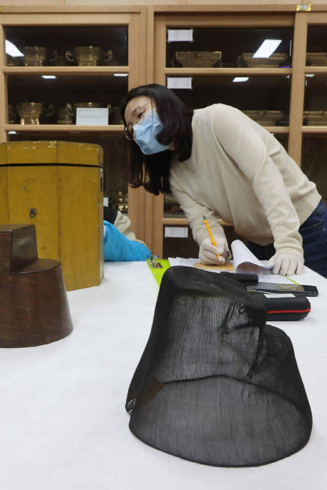 이날 행사는 국립고궁박물관이 국가무형유산 전승자들을 위해 기획한 프로그램 ‘수장고 속 왕실 유산 심층조사 프로그램’으로 마련됐다. 황 씨 외에도 국가무형유산 탕건장(갓을 쓸 때 받쳐 쓰는 모자인 ‘탕건’과 ‘정자관’을 만드는 장인) 전승교육사 김경희 씨, 매듭장 전승교육사 박선경 씨와 이수자 박선희 씨 등이 수장고를 찾았다.