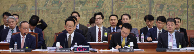 서태건(왼쪽부터) 게임물관리위원회 위원장, 한상준 영화진흥위원회 위원장, 유현석 한국콘텐츠진흥원장 직무대리, 강석원 한국저작권위원회 위원장이 23일 서울 여의도 국회에서 열린 문화체육관광위원회 국정감사에 출석해 있다. (사진=뉴시스).