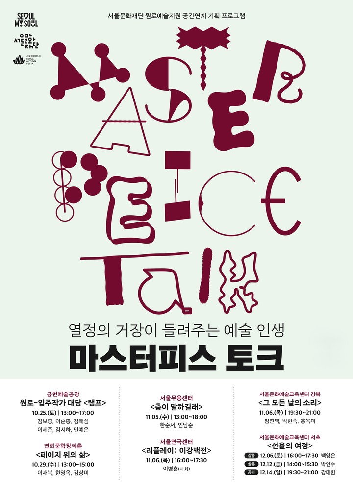 서울문화재단에서는 이러한 '기회의 장벽'을 허물기 위해 '2025 원로예술지원사업'의 일환으로 '마스터피스 토크'를 개최한다. 연극, 무용, 음악, 전통, 시각, 문학 등 각 분야의 원로예술가들이 직접 무대에 올라 자신의 예술 인생을 풀어내는 프로그램이다.