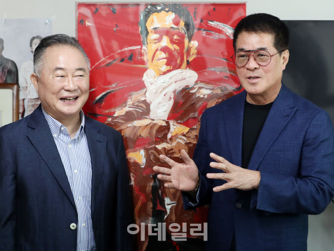예종석(왼쪽) 대기자와 박명성 예술감독이 대담을 하고 있다. 배경이된 그림은 임남훈 작가가 그린 박명성 감독의 모습이다. 이 그림은 박명성 감독의 명함에도 새겨져 있다. (사진=김태형 기자)