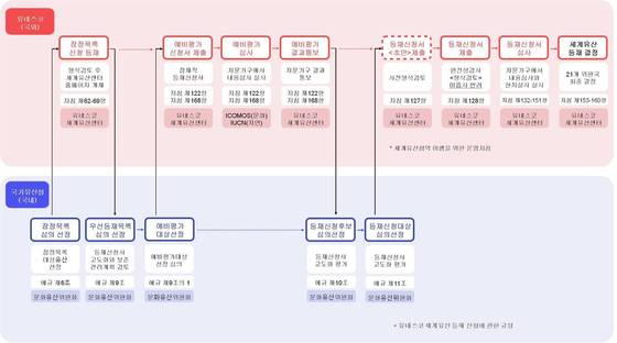 유네스코 세계유산 등재신청은 '잠정목록→우선등재목록→예비평가 대상→등재 신청 후보→등재 신청 대상'의 국내 절차를 거친다.