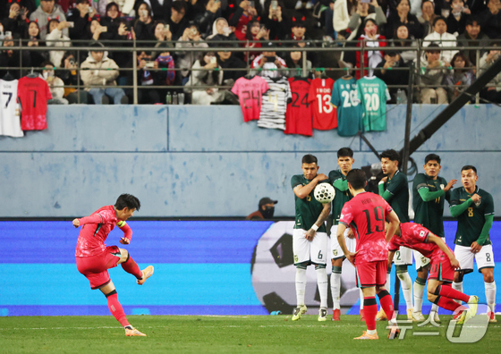14일 오후 대전 유성구 대전월드컵경기장에서 열린 ‘하나은행 초청 국가대표팀 친선경기’ 대한민국과 볼리비아의 경기에서 대한민국 손흥민이 프리킥 골을 넣고 있다. 2025.11.14/뉴스1 © News1 황기선 기자