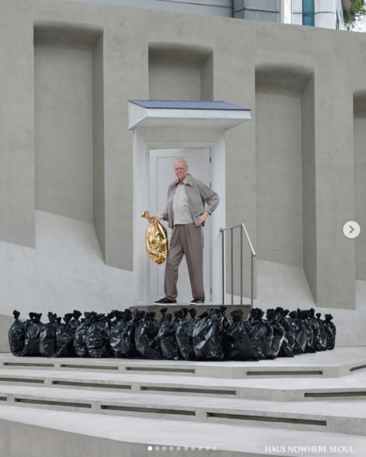 작품은 수많은 검은 비닐봉지가 거대한 파도처럼 일렁이는 공간에, 실물보다 큰 초현실적 노인 조형물이 자리한 모습이다. 특히 노인의 손에 쥐어진 '황금빛 봉지'는 호기심과 발견의 상징으로 관객에게 새로운 상상력을 건넨다.