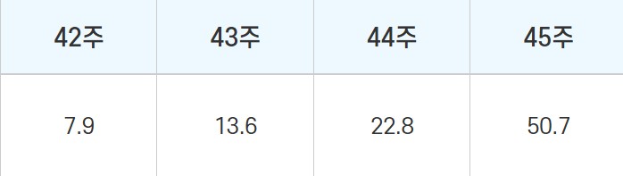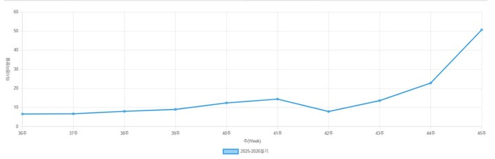 최근 4주간 독감 증상 환자는 42주 차(10월 12일~18일) 7.9명에서 43주 차(10월 19일~25일) 13.6명, 44주 차(10월 26일~11월 1일) 22.8명, 45주 차(11월 2일~8일)에는 50.7명으로 급격히 증가했다.