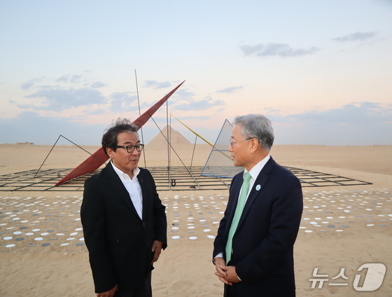 15일, 박종규 작가(왼쪽)가 작품 '영원의 코드' 현장을 방문한 김용현 주이집트대사와 작품에 대해 대화를 나누고 있다. © 뉴스1 김정한 기자