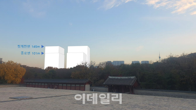 세운4구역에 최고 높이 145m의 고층건물이 들어섰을 때 종묘 정전 상월대에서 바라본 경관 가상도. (사진=국가유산청)