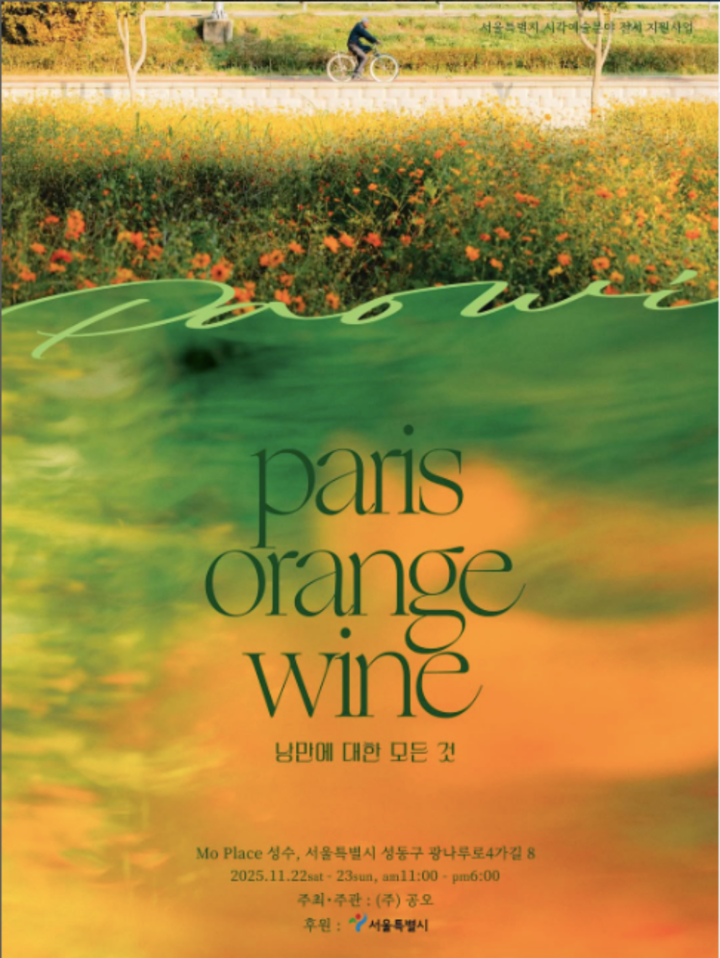 빠르게 흘러가는 일상 속에서 희미해진 감각과 정서를 회복시키기 위한 특별한 전시가 열린다. 서울특별시가 후원하고 (주)공오가 주최하는 감정 예술 전시 'Paris Orange Wine: 낭만에 대한 모든 것'이 오는 22일부터 23일까지 성수동 모플레이스에서 개최된다.