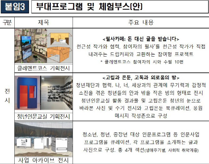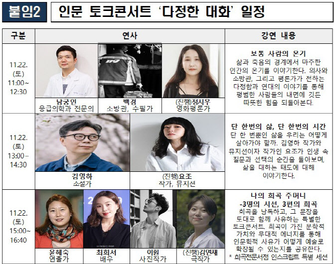 22일에는 △남궁인 응급의학과 전문의와 백경 소방관, 정시우 영화평론가가 ‘보통 사람의 온기’를 △김영하 소설가와 요조 작가가 ‘단 한 번의 삶, 단 한 번의 시간’을 △윤혜숙 연출가와 최희서 배우, 이훤 사진작가, 김연재 극작가가 ‘나의 희곡 주머니’를 주제로 강연한다.