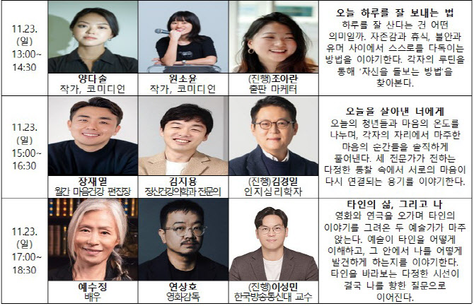 23일에는 △양다솔 작가와 원소윤 작가, 조아란 출판마케터가 ‘오늘 하루를 잘 보내는 법’을 △장재열 월간 ‘마음건강’ 편집장과 김지용 정신건강의학과 전문의,김경일 인지심리학자가 ‘오늘을 살아낸 너에게’를 △예수정 배우와 연상호 영화감독, 이성민 한국방송통신대 교수가 ‘타인의 삶, 그리고 나’를 주제로 강연을 이어간다.