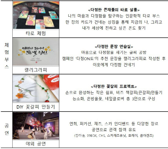 이번 축제의 대표 프로그램인 인문 토크콘서트 ‘다정한 대화’에서는 서로 다른 분야의 연사들이 한자리에 모여 단절된 시대에 나와 타인, 사회를 잇는 다정한 시선을 회복하기 위한 메시지를 전한다.
