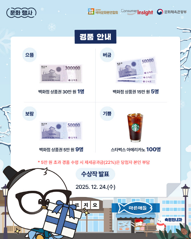 접수된 가게 이름은 △우리말 기준 적합성 △재미와 말맛 △독창성 등을 기준으로 ‘가게 이름 선정위원회’에서 예비 심사를 진행한 후, 전국 1000명 대상 국민 선호도 조사와 심사위원회의 심의를 거쳐 수상작을 선정할 예정이다. 수상작은 12월 24일 발표한다.