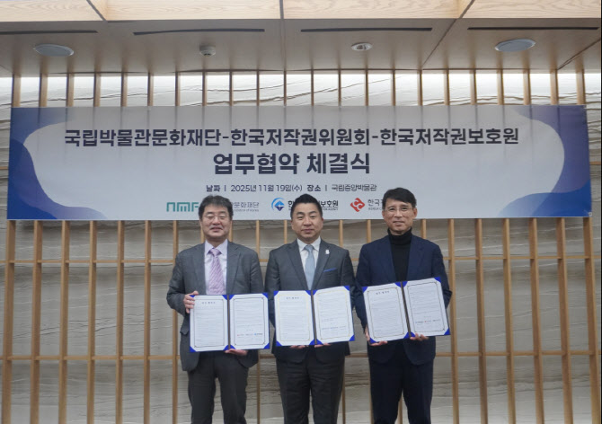 국립박물관문화재단, 한국저작권위원회, 한국저작권보호원은 19일 서울 용산구 국립중앙박물관에서 업무협약 체결식을 가졌다. 왼쪽부터 강석원 한국저작권위원회 위원장, 정용석 국립박물관문화재단 사장, 박정렬 한국저작권보호원 원장. (사진=국립박물관문화재단)
