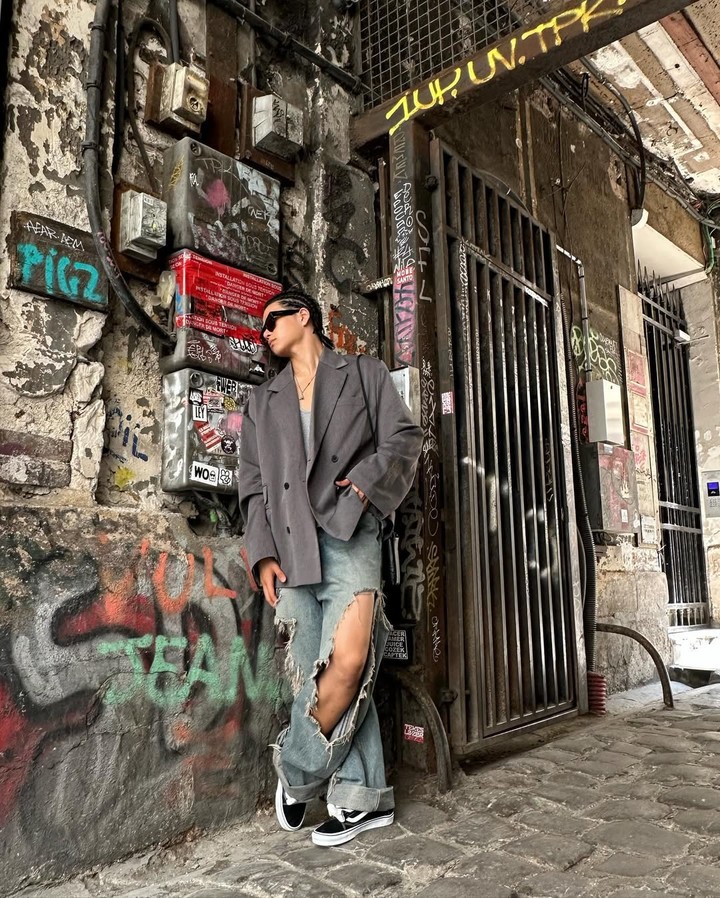 타잔은 그레이 더블 브레스티드 블레이저에 과감하게 찢어진 디스트로이드 데님 팬츠를 매치해 거친 스트리트 감성을 강조했다. 빈티지한 골목과 어우러진 오버사이즈 실루엣과 컷팅 디테일은 90년대 유스 컬처를 재해석한 스타일링으로 해석된다.