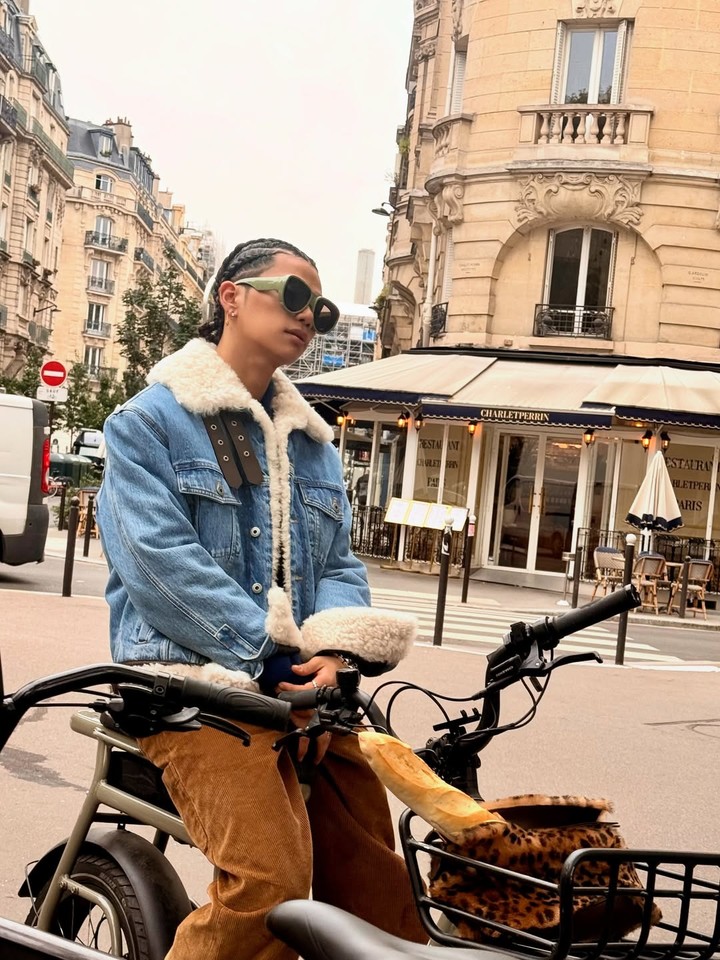 이어 공개된 또 다른 컷에서는 퍼 디테일의 데님 셰르파 재킷과 코듀로이 팬츠, 그리고 바이커 선글라스로 프렌치 빈티지와 아메리칸 캐주얼을 절묘하게 믹스매치했다.