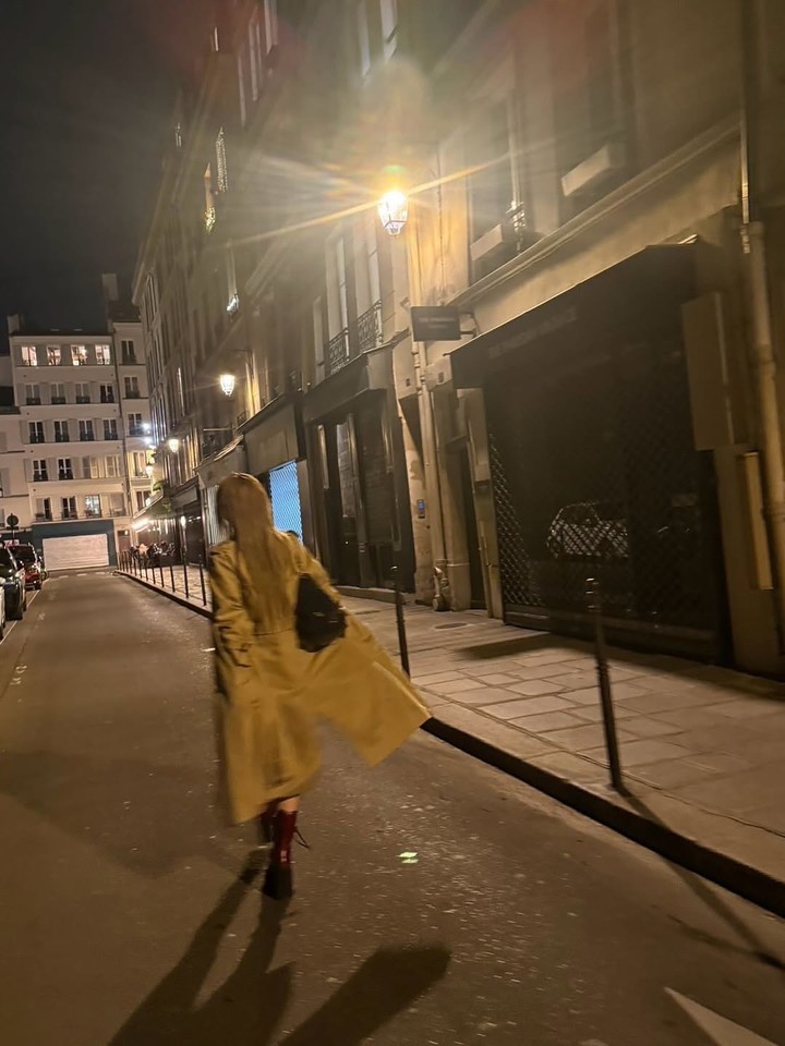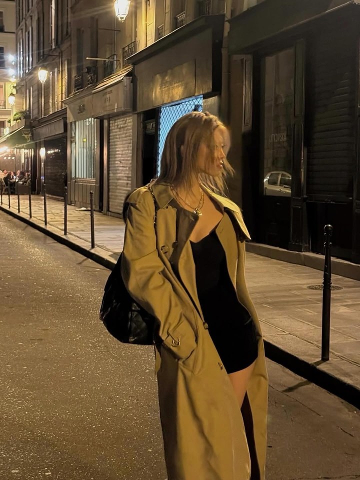 베일리는 야간 도시 배경 속 베이지 트렌치코트를 활용해 클래식한 무드와 시크한 블랙 미니 드레스를 조화시켰다. 흐트러진 헤어스타일과 자연스러운 포즈는 파리지앵 무드를 연상케 하며, 고전적인 아이템을 현대적으로 풀어낸 감각이 돋보인다.