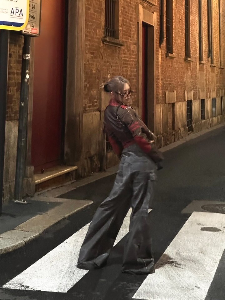 딥 와인과 브라운 계열의 숏 레더자켓과 광택감 있는 와이드 팬츠를 매치해, 강렬하면서도 유니크한 실루엣을 완성했다. 어두운 조명 아래 선명하게 드러난 의상은 세련된 텍스처와 구조적인 스타일링의 조화를 강조한다.