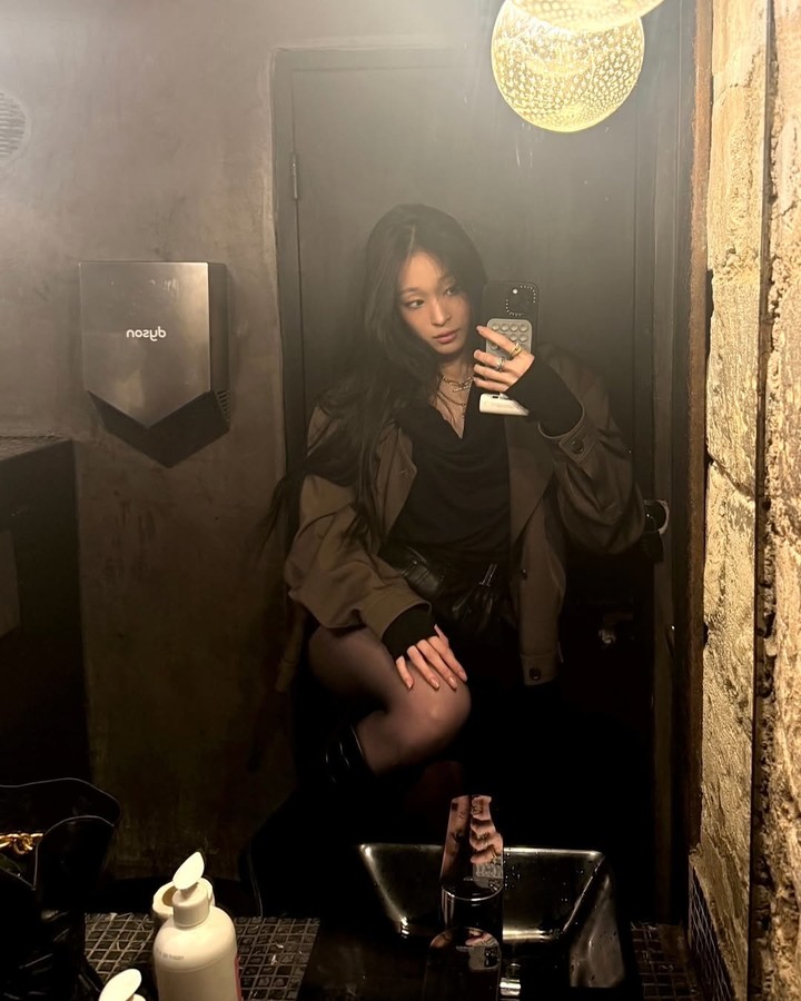 더하여 베이지 야상 점퍼와 블랙 미니 원피스의 레이어드로 시크한 무드를 연출, 전반적으로 이지하면서도 스타일리시한 '오프 듀티 룩'을 완성했다.