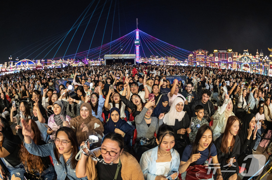 16일(현지 시각) 아랍에미리트 두바이 글로벌 빌리지에서 열린 '2025 K-엑스포 아랍에미리트: 올 어바웃 케이 스타일'의 한 프로그램인 'K팝 콘서트'에 참석한 현지 팬들이 환호하고 있다. (사진가 장석현 제공, 재판매 및 DB금지) 2025.11.17/뉴스1