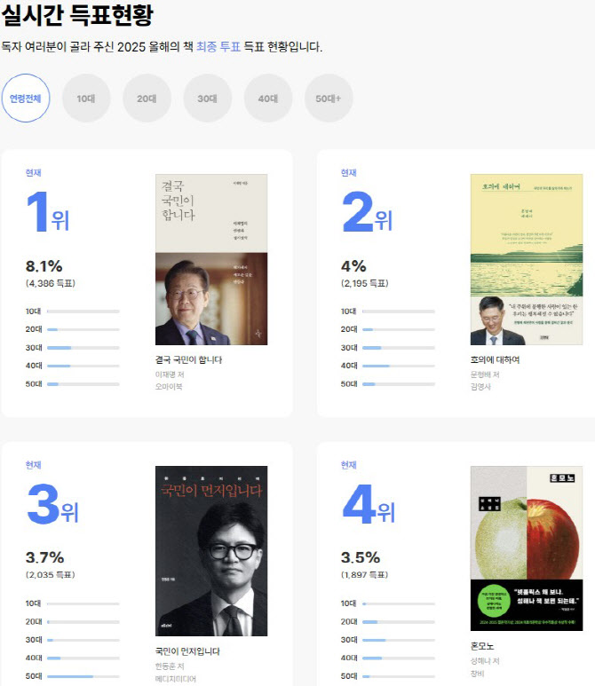 연령별로 보면 10대 독자들이 올해의 책으로 가장 많이 꼽은 책은 성해나 작가의 단편 소설집 ‘혼모노’인데 비해, 20대부터 40대 독자들은 이 대통령의 책 ‘결국 국민이 합니다’를 가장 많이 선택했다. 50대 이상 독자들의 선택은 한 전 대표의 책 ‘국민이 먼저입니다’ 였다.