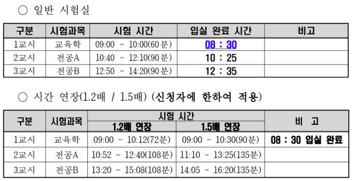 시험은 1교시 교육학 오전 9시~10시(60분), 2교시 전공 A 오전 10시 40분~오후 12시 10분(90분), 3교시는 전공 B 오후 12시 50분~오후 2시 20분(90분)간 진행될 예정이다. 장애인 중 시간 연장 신청자에 한해서는 1.2배, 1.5배 늘어난 시간으로 시험이 치러질 예정이다.