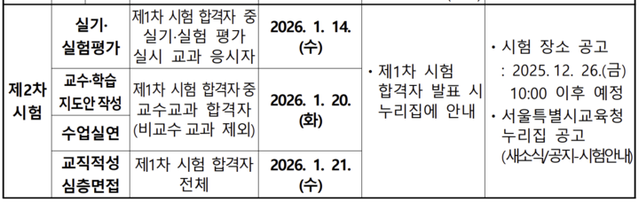 실기·실험 평가 실시 교과 응시자를 대상으로 하는 실기·실험평가는 오는 2026년 1월 14일(수), 교수교과 합격자를 대상으로는 교수·학습 지도안 작성 및 수업실연은 2026년 1월 20일(화), 1차 시험 합격자 전체를 대상으로 하는 교직적성심층면접은 2026년 1월 21일(수)로 순차적으로 실시된다.
