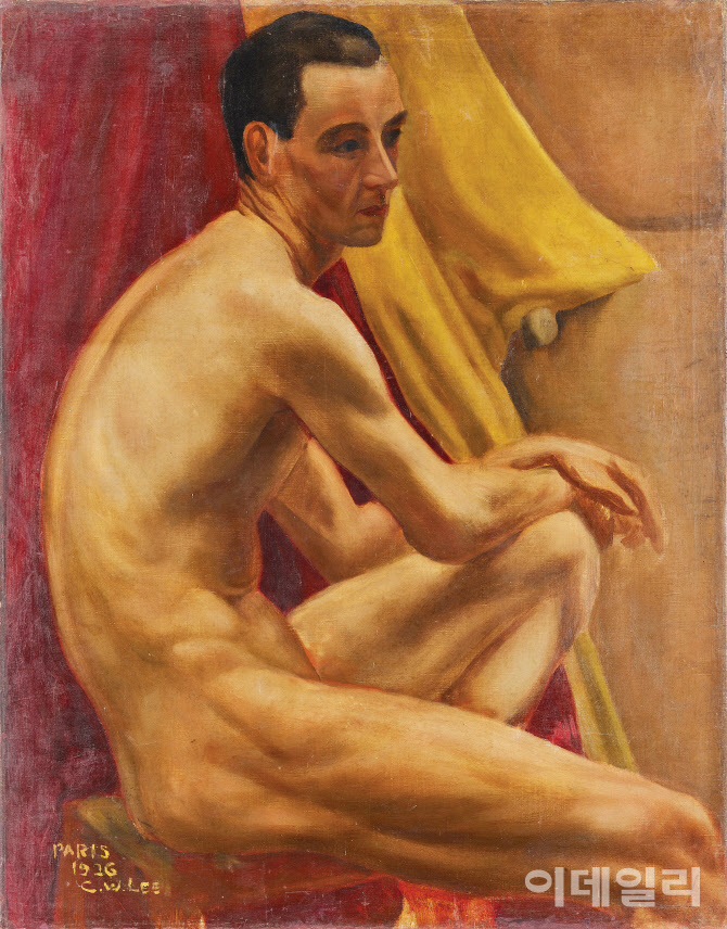 이종우의 ‘누드(남자)’(1926). 한국인으로는 처음으로 프랑스 파리에서 유학하던 시기(1925∼1928)에 그렸다. 아카데믹한 소재와 방식으로 인물화를 주로 그렸던 초기의 작업이다. 작품 속 탄탄한 근육을 가진 서양인 남성모델은 비스듬히 앉아 슬쩍 세운 왼쪽 무릎에 두 팔을 얹고 있다. 나부끼듯 늘어뜨린 붉은 장막과 주황 장막이 근육질 남성의 운동성을 더욱 도드라지게 한다. 전체적으로 어두운 분위기 속에서 어슴푸레 빛을 받고 있는 탄탄한 육체를 작가는 세밀한 데생과 사실적인 묘사로 강조하고 있다. 지난 5월 1일 국립현대미술관 과천에서 개막한 ‘MMCA 과천 상설전: 한국근현대미술Ⅰ’에 나왔다. 캔버스에 유화 물감, 78×62㎝. 국립현대미술관 소장.