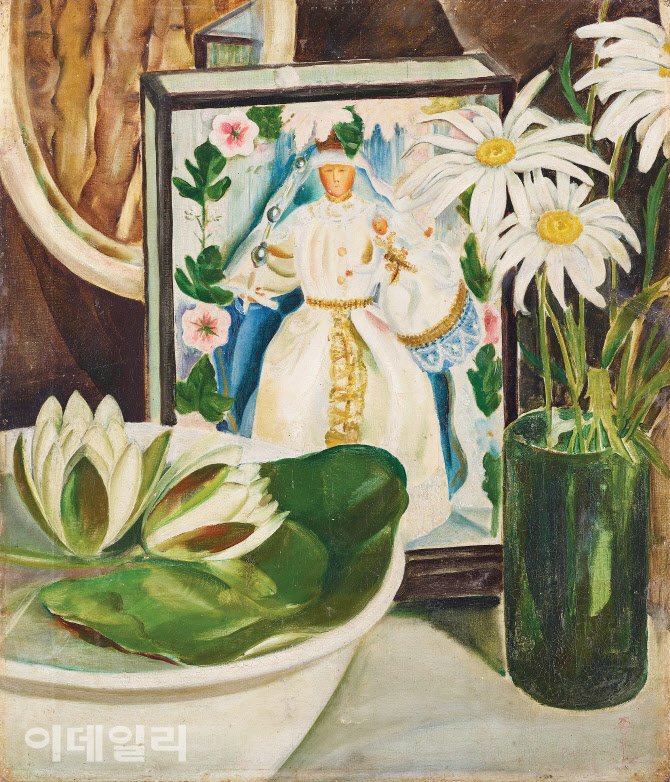 이종우의 ‘인형 있는 정물’(1927). 프랑스의 권위 있는 미술전 ‘살롱 도톤’에서 입선(1927)한 한국인 최초의 유화다. 1903년 창단한 살롱 도톤은 파블로 피카소, 앙리 마티스, 모리스 드 블라맹크 등 당시 혁신적 작가들이 참여해 근대 회화사의 흐름을 바꾼 새로운 미술지향. 그만큼 작품에선 수상 이상의 의미까지 챙길 수 있다. 흰색과 녹색을 주조로 한 인형·꽃 등 명랑한 분위기를 뒤쪽의 거울·벽에 묻힌 어두운 갈색이 가라앉히며 균형을 잡고 있다. 같은 해 살롱 도톤에서 입선한 작품으론 ‘모부인의 초상’(2027)도 있다. 캔버스에 유화 물감, 53.3×45.6㎝. 국립현대미술관 소장.