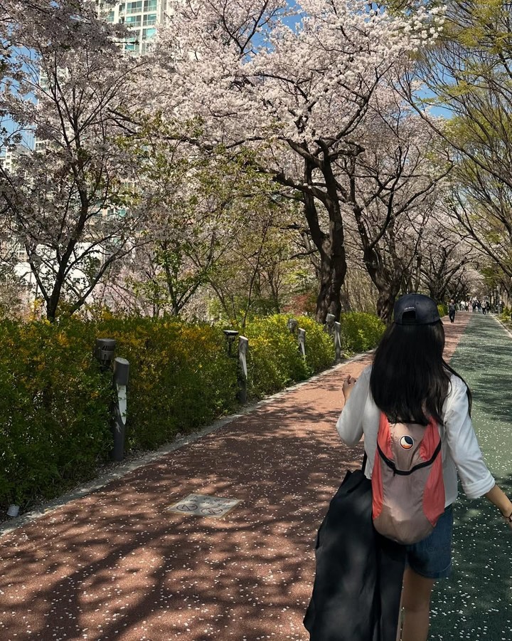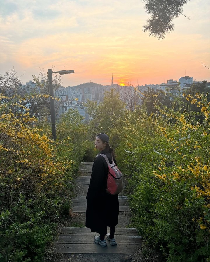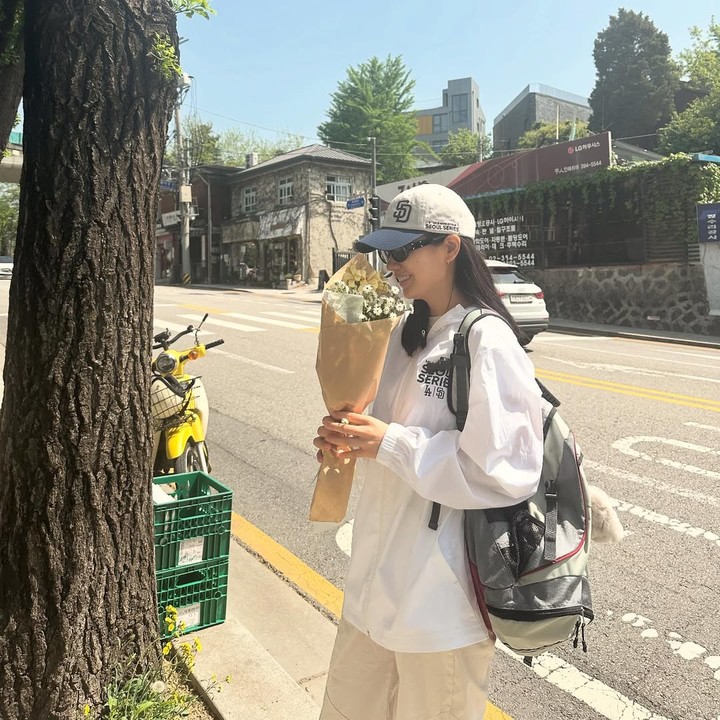 라이트 베이지 톤의 롱 쇼츠와 오버핏 화이트 셔츠를 매치해 햇볕 아래에서도 쾌적한 착용감을 유지할 수 있도록 했으며, 루즈한 실루엣은 자연스러운 체형 커버와 함께 활동성을 높인다. 여기에 야구 모자와 백팩을 더해 액세서리의 균형감도 놓치지 않았다.