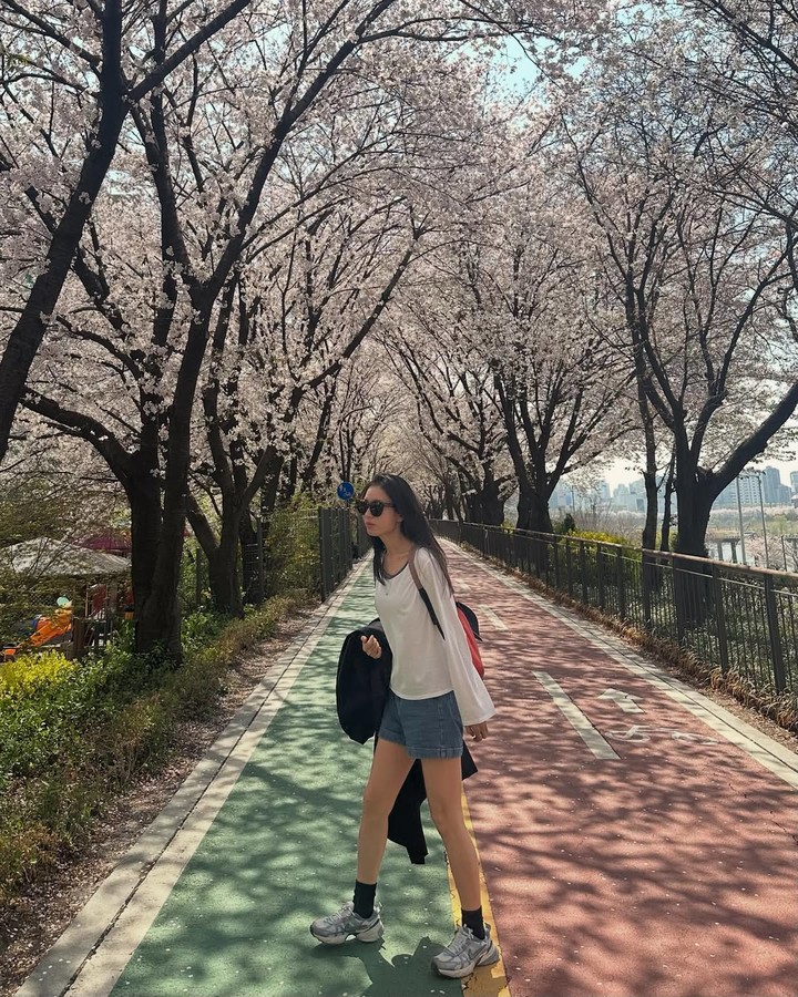 봄 시즌 룩에서는 루즈한 핏의 라운드넥 톱에 하이웨이스트 데님 쇼츠를 매치해 심플하지만 균형 잡힌 실루엣을 연출했다. 상의는 여유로운 드레이프가 강조되는 코튼 소재로 자연스러운 움직임을 살렸고, 하의는 허벅지 중간까지 오는 기장감으로 경쾌하면서도 안정적인 비율을 만들어냈다.