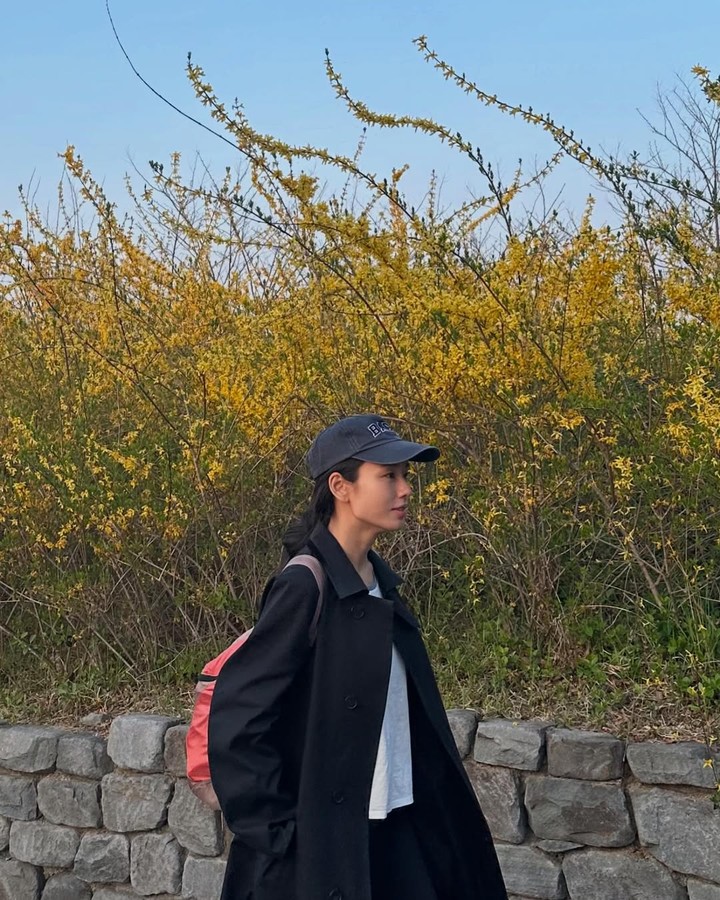 간절기 룩에서는 블랙 싱글 버튼 코트를 활용해 실용성과 스타일을 동시에 챙긴 모습이다. 넉넉한 품의 롱 코트는 이너웨어에 구애받지 않으며, 베이식한 화이트 티셔츠와 조화롭게 어우러져 도시적인 미니멀리즘을 강조한다. 여기에 톤 다운된 챠콜 컬러의 볼캡과 버건디 백팩을 더해 포인트를 주되 전체적인 컬러 톤은 차분하게 유지했다.