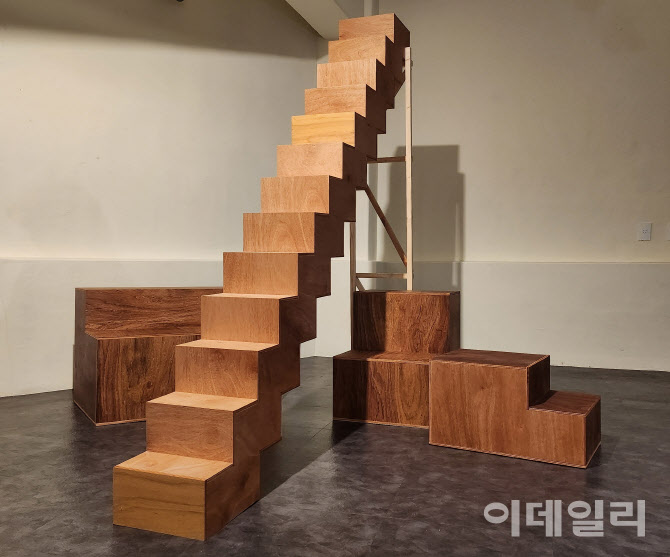 작가 정혜경(48)이 나무로 층층이 쌓아올린 ‘103개 기억의 파편들’(2025)은 그 걸쭉한 시간을 축적한 조형물이 됐다. 한 언덕길에 놓인 103개의 계단을 13개로 압축했다. 사실 눈으로 본다면 이 작품은 반쪽짜리다. 작가가 퇴근길 현장에서 수집한, 일상의 소리를 입힌 ‘사운드’가 합쳐져야 비로소 완전체가 되는 구조라서다. 얹히고 겹친 ‘도시의 지층’이라고 할까. “물리적 경사뿐 아니라 삶의 무게까지 실은 장소로” 말이다.