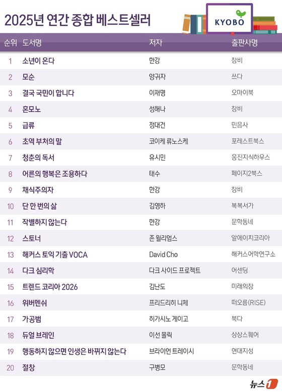 1일 교보문고 연간 종합베스트셀러 집계(1월 1일~11월 28일)에 따르면 지난해부터 시작된 한강의 노벨문학상 수상 효과는 올해도 지속됐고, 그의 소설 '소년이 온다'는 2025년 한 해 가장 많이 판매된 책으로 기록됐다. 이 작품은 '기억'과 '치유'라는 보편적 주제로 전 연령대의 공감을 얻었다. 이 밖에도 한강의 작품은 '채식주의자'가 9위, '작별하지 않는다'가 11위에도 이름을 올렸다.
