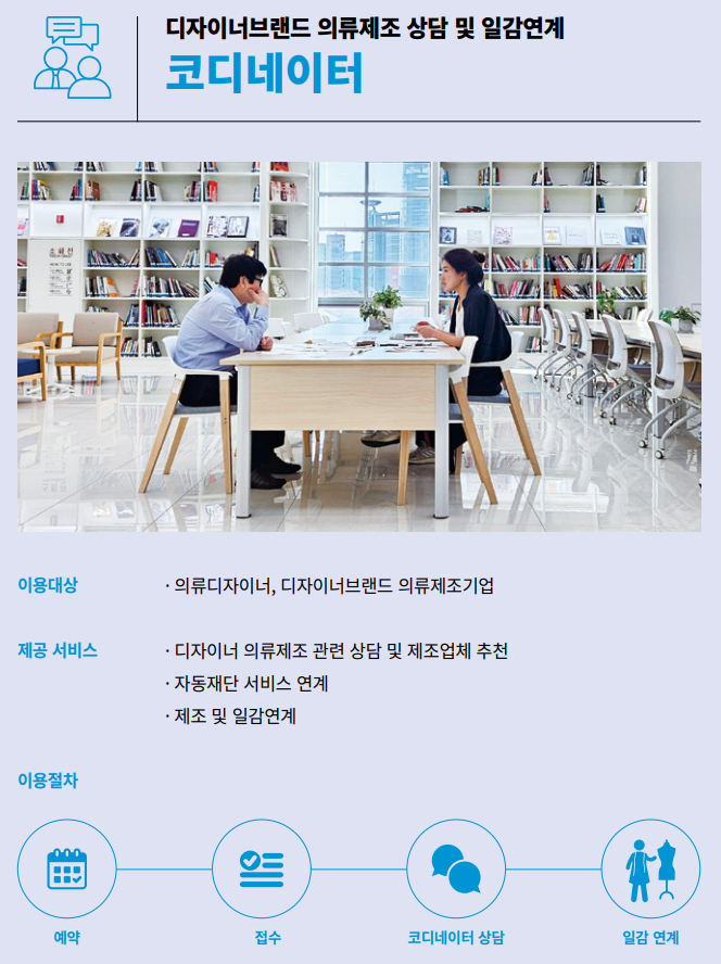 또한 마스터 기업은 서울패션허브가 운영하는 ‘의류제조 코디네이터’의 일감 연계 지원도 받는다. 코디네이터는 제조업체의 전문 생산 품목, 취급 소재, 주거래처 등 세부 정보를 기반으로 디자이너 브랜드의 요구에 적합한 샘플실, 패턴실, 임가공 업체를 맞춤형으로 추천-연결하는 역할을 한다.