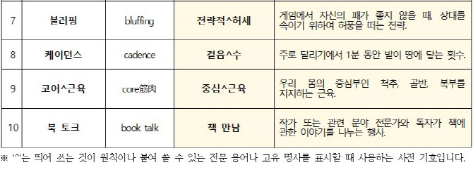 또 △‘북 토크’(book talk)는 ‘책만남’ △‘그린 리모델링’(green remodeling)은 ‘친환경 새 단장’ △‘메디컬 테스트’(medical test)는 ‘신체 정밀 검진’으로 정비했다.