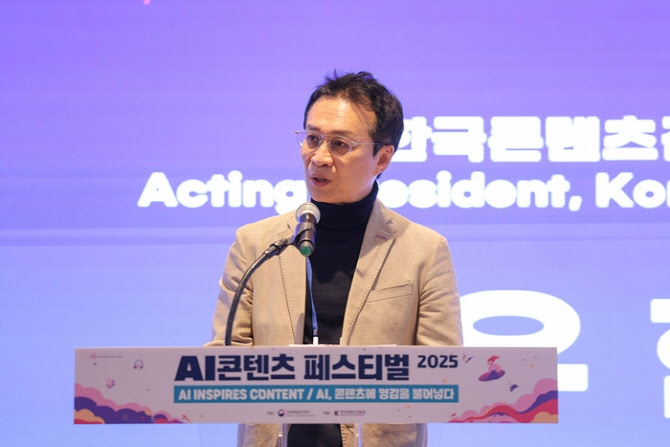 유현석 한국콘텐츠진흥원 원장 직무대행이 AI 콘텐츠 페스티벌 2025 개막식에서 개회사를 전하고 있다.(사진=한국콘텐츠진흥원)