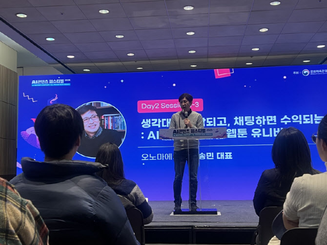웹툰기업 오노마에이아이의 송민 대표는 ‘생각대로 창작되고, 채팅하면 수익되는 시대: AI가 만드는 1인 웹툰 유니버스’를 주제로 한 발표에서 “소비자의 콘텐츠 소비가 참여형, 대화형 소비로 이동하고 있다”며 “인터랙티브 콘텐츠에서 AI 대화형 콘텐츠로 확장되고 있다”고 짚었다. 이어 “AI를 통해 창작의 진입장벽을 제거하고 누구나 자신의 세계관을 웹툰 IP로 만들 수 있다”며 “AI는 창작자에게 새로운 기회가 될 것”이라고 확신했다.