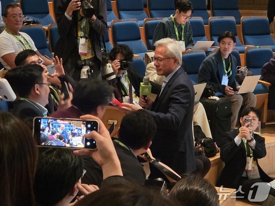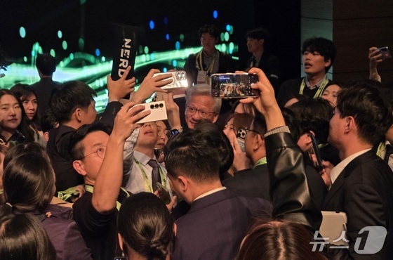 31일 경주 예술의전당 원당홀에서 열린 엔비디아 기자간담회에서 젠슨 황 엔비디아 CEO가 셀카를 찍으려는 기자들에게 둘러싸여 있다.2025.10.31/뉴스1 © News1 박기범 기자