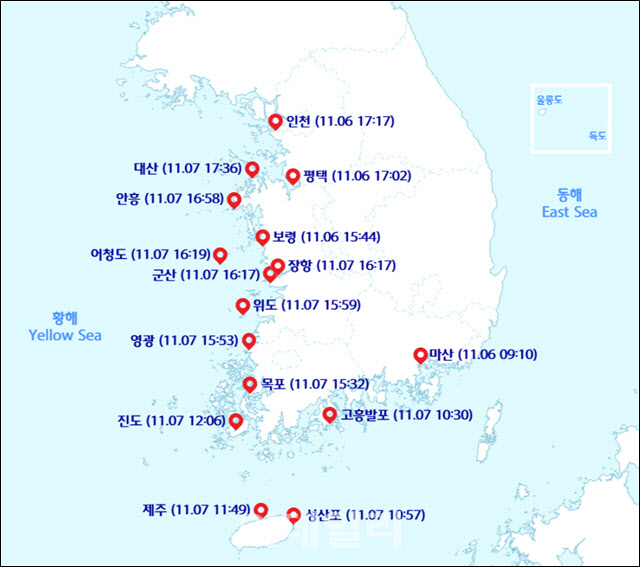 11월 근지점 대조기 지역별 최고조위 예상 시간.(자료=해수부)