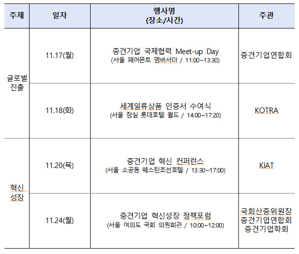 한편 중견기업 주간은 중견기업계 최대 행사로, 중견기업법에 따라 2018년부터 매년 11월 셋째 주에 개최되고 있다. 세부사항은 중견기업연합회 및 주제별 행사 주관기관 홈페이지에서 확인할 수 있다.