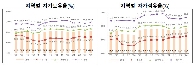 작년 자가를 보유하고 있는 가구는 전체 가구의 61.4%로 2023년(60.7%) 대비 0.7%포인트 상승했다. 도 지역 69.4%, 광역시 등 63.5%, 수도권 55.6%로 모두 전년 대비 자가보유율이 각각 0.8%포인트, 1.2%포인트, 0.5%포인트 높아졌다.